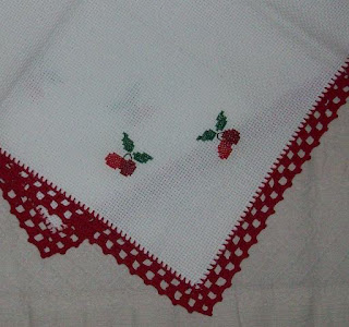 Este paninho foi a minha filha que bordou quando era adolescente. Agora não liga a estas coisas mas eu fiz-lhe a surpresa de colocar o pano no blog e ela achou graça.
