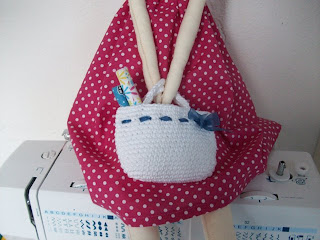 Há algum tempo que queria fazer uma Tilda costureira mas estava sem tempo. Como ela não tem máquina de costura, fiz-lhe uma cestinha para os materiais.