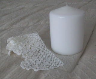 Comprei uma vela branca e lembrei-me que tenho umas rendas de crochet que não estavam a ser utilizadas. Com um pouco de cola ficou uma vela diferente e cheia de charme.